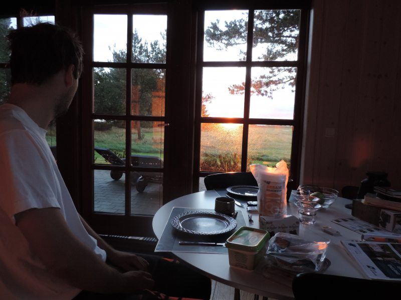 Na het ijsje afbakbroodjes gebakken en opgegeten. Daarna lekker uurtje op de bank gehangen. Doordat het weer beter werd dan verwacht en zelfs de zon weer ging schijnen besloten om achter ons huis de bossen in te lopen. na een tijdje zagen we en kikkertje, en even later een hert die het op het lopen zette. We hoopte naar de zee te kunnen lopen maar helaas niet te doen afgezet beschermd gebied. Na 45 minuten lopen besloten terug te wandelen, hoorde we naast ons ineens iets op hoeven wegschieten en liep gauw voor ons het pad op. Toen zagen we dat het een hert was. Eenmaal bij het huisje zagen we dat laag water was en zijn in de auto gestapt en het pad uitgereden en nu was het hele wad waar we vanmorgen met water stonden was nu drooggelegd en dus een stukje op gelopen. Heel bijzonder. Inmiddels al 5 uur en we hadden honger dus weer terug, ik heb de aardappelen opgezet en nog even buiten in de zon gaan zitten, deze is schaars deze week dus nog maar even van genomen. Daarna rest van eten opgezet en lekker Hollandse pot gegeten. Nadat Erik de afwas gedaan had neergestort op de bank met glaasje alcohol. Zo eerste dag was mooi maar vermoeiend en na het drankje gedoucht en naar bed.
