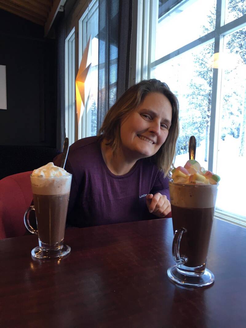 Eenmaal terug toch best blij dat alles goedging en kon mijn armspieren laten rusten. Ben kapot hahahah. We hebben een snack box bij de receptie besteld en in de kamer alle lagen uitgegooid. Bij de bar een warme choco besteld en even tot rust gekomen. Mijn spieren zijn lekker aan krampen nog, toch te gespannen geweest op de sneeuwscooter maar niet gek een beest van 300 kilo in bedwang houden is lastig. Na een uurtje besloten om nog even naar buiten te gaan, we gaan sleeën want die heeft het hotel te leen staan. Een mooie heuvel opgezocht en daar gingen wij. Heerlijk voelen ons net een klein kind.