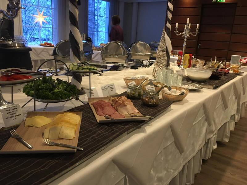 8:00 de wekker, opfrissen en 9:00 aan het ontbijt. Gesprek van het ontbijt is het noorderlicht. Wij blijken degene te zijn die het langst alles hebben gezien, wat was het mooi. Als iedere dag niets mis met het ontbijt, alles vers gemaakt verse jam, warm eigen gemaakt brood, van alles aan beleg en yoghurt. De eitjes natuurlijk niet te vergeten. Buikje vol op naar de kamer, we moeten ons dik aankleden want het is een spannende dag. We besluiten 2 lagen aan te doen onder ons thermo pak. Na alles aan te hebben, wat wel even duurt want ja je trekt zoveel aan, naar de receptie waar wij worden opgewacht.