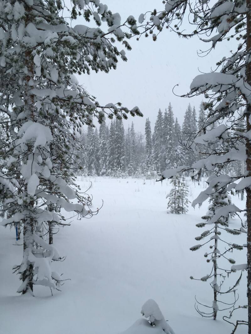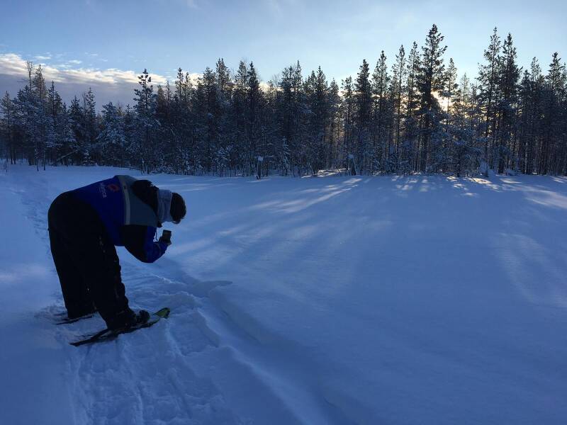 Ontbijt, lekker en dan klaarmaken voor onze into the wild dag. Een volle dag met sneeuwscooter, en na de sneeuw val van gisteren wordt het niet makkelijk gemaakt. De weg zit vol hobbels en ik ben nogal langzaam maar ja beter langzaam en veilig dan ene na andere ongeluk. Na een uurtje gingen wij een pad in wat nog geen pad was en hoppa daar lagen wij op onze kant. Zie dan maar op te staan vanuit een meter sneeuw.