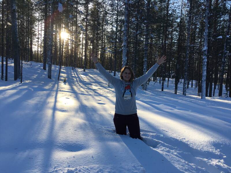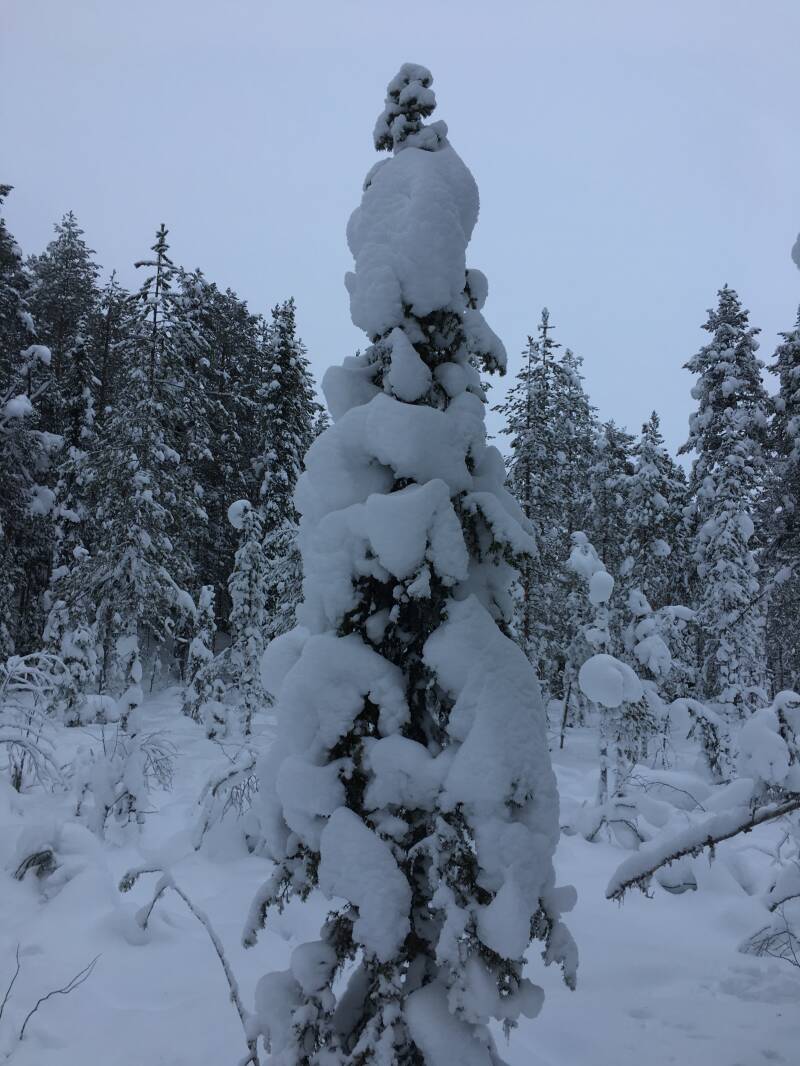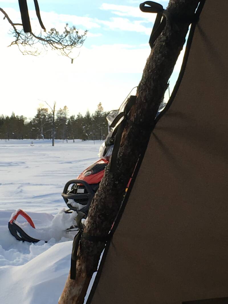 Prachtig echt prachtig door die bergen sneeuw heen lopen, in de bossen. Na uur lopen kwam de zon op en klaarde de lucht op, helblauwe hemel. Wat een genot is dit zeg! Nog half uur verder, een tipi tent waar wij warme bessensap kregen. Even opwarmen ook al is het maar -12 volgens de Finnen is toch heerlijk hoor. Zo via een ander pas weer terug, af en toe een zijstapje diepe sneeuw in en gelijk tot de knieën erin, wil niet weten hoever je zakt als je met gewone schoenen erin stapt. 3 uur lang genoten en veel foto’s gemaakt.