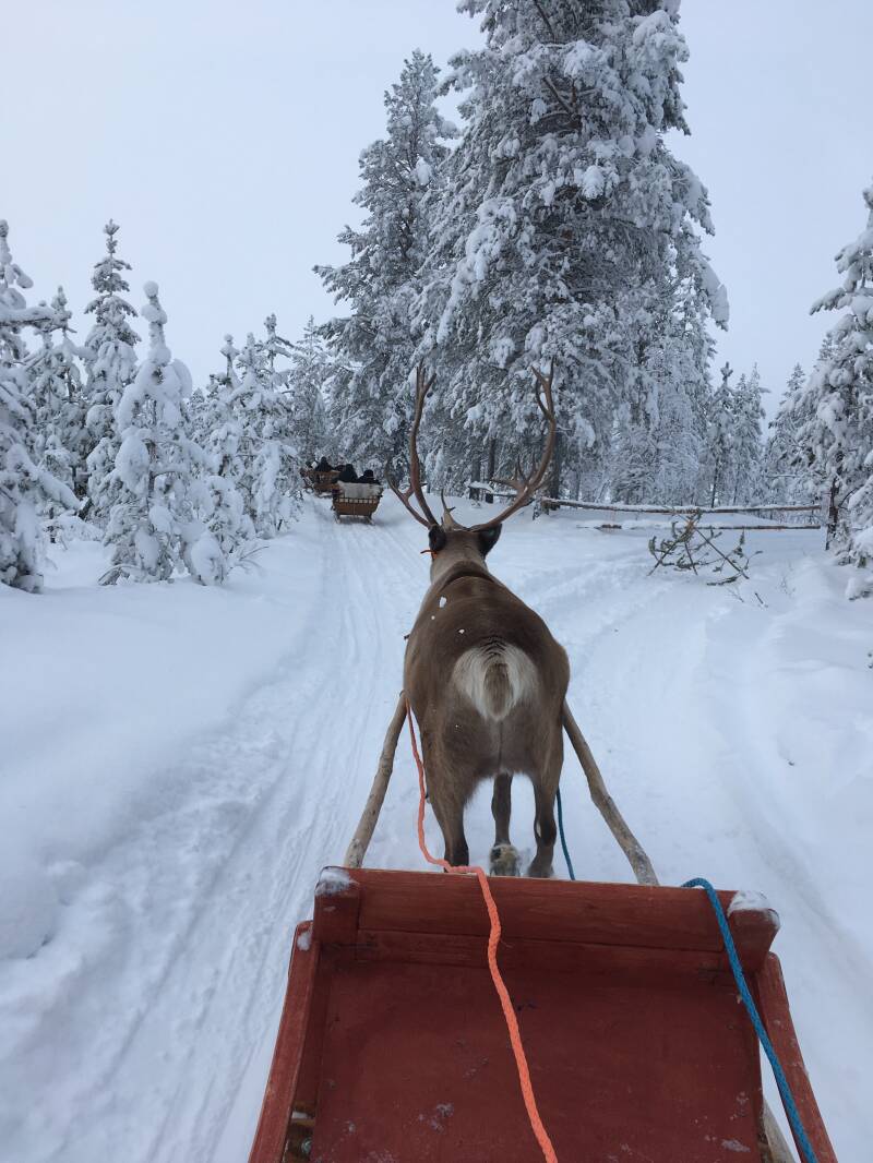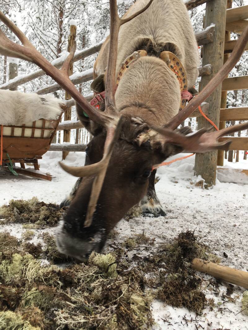 Met busje worden wij opgehaald, en na half uurtje rijden waren wij er. Na een uitleg mogen wij in de slee gaan zitten, toen er beweging in de stoet kwam sloeg ons rendier op hol, gets en na even klooien hem aan de stop gekregen. Mij rot geschrokken maar we konden weer verder op pad. Lekker de natuur door achter het rendier aan en achter ons hadden wij last van een hijgend rendier hahaha. Na uurtje sleeën waren we terug en lekker opwarmen in een huisje met warme drank en koekje. Iemand had ook Valentijn koekjes meegenomen en uitgedeeld zo lief. Eenmaal weer terug in hotel een spelletje gespeeld en even opwarmen voor wij de sneeuw ingaan want vandaag valt er veel veel verse sneeuw.