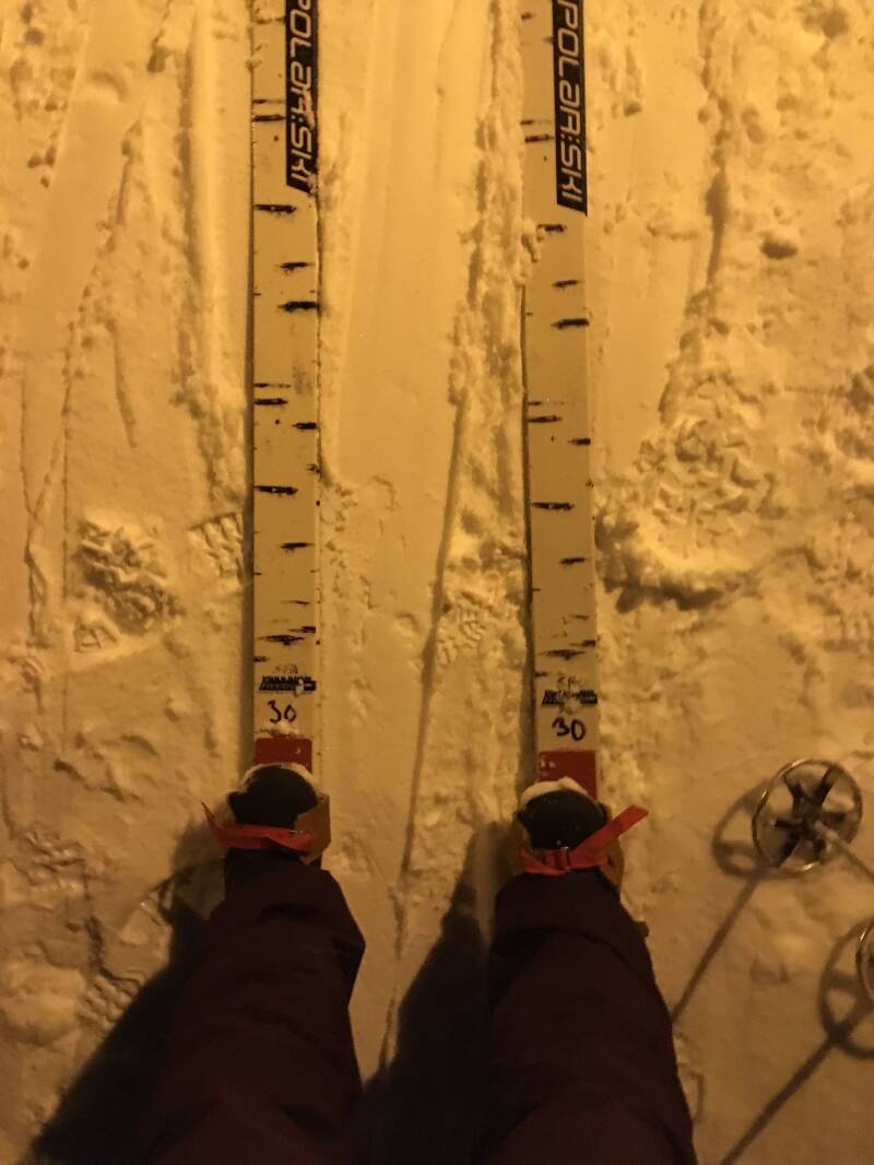 Een leuke dag gehad zo, eenmaal in hotel een kop warme choco gescoord en nog even half uurtje de sauna ingegaan. Na het eten laatste excursie: foreest skiën, mama gaat niet mee omdat toch wel zwaar voor het lijf is. Ik heb het geweten, was ploeteren. Er was geen pad en die maakte wij met de gids, wat het zwaar maakte. 4 keer gevallen en zie dan maar met die ski’s omhoog te komen. Op gegeven moment wel door dat het goed werkte om 1 ski uit te doen om op te staan maar dan nog uit de hoge sneeuw komen is niet altijd even makkelijk. Halverwege kwam er ook gezellig even een sneeuwstorm over, en zijn goed uitgetest. Na 3,5 uur ploeteren klaar en nog een drankje gedaan met de medereizigers. 23:45 terug naar de kamer, goh wat heb ik goed geslapen zeg die nacht.