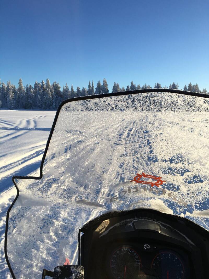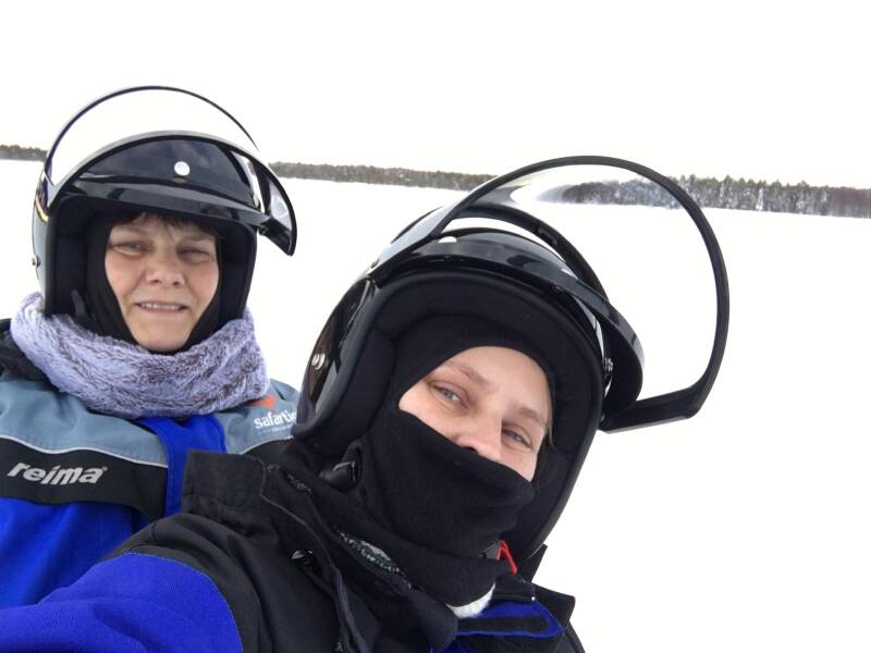 Eerst een helm halen beneden, Jezus wat is het heet binnen hahahah. Gauw helm mee en naar buiten. Eenmaal buiten staan de beesten op ons te wachten, de sneeuwscooters. Daar mag ik op rijden vandaag met mama achterop, een snelle uitleg en dan mogen we al. Jeetje, wat is dat vreemd zeg, hij vindt veelal zijn eigenweg en ik mag hem onder controle houden en das nog niet zo makkelijk. Ik ben de enige vrouw die rijdt ook nog eens, voel geen druk hoor. Al snel wordt ik door de begeleiding naar voren gehaald, langzaamste voorop.... bedankt hè moet gewoon even wennen aan de kracht en hoe je zo een ding bestuurd. Duiken gelijk de heuvels in, smalle doorgangen tussen bomen door maar laat mij niet kennen en ga gewoon door. Op gegeven moment het meer over, en vol gas. Ik bleef steken op 50 km per uur maar hij kan veel harder maar door al dat gesteuter moet je zoveel corrigeren en das zo zwaar dat ik dat wel hard genoeg vond.