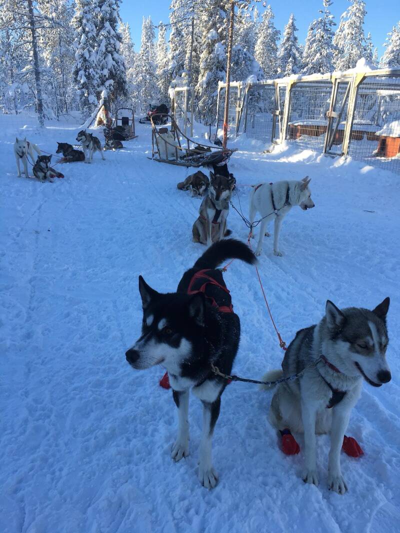 Eenmaal bij de kennel, heul heul veel honden. Blaffen en een kabaal, konden elkaar niet eens verstaan. Wat een enthousiasme hebben die dieren, ze willen gaan, gaan, gaan. Eerst uitleg over hoe de slee te bedienen. 1 iemand mag zitten, en 1 besturen. Besturen is vasthouden en remmen. Ik mag beginnen met het zware werk. Ok mama ploft neer in de slee, en nu wachten tot wij los gelaten worden. Voor ons gaan ze 1 voor 1, en dan zijn wij aan de beurt. Je moet de honden echt even tegen houden in begin want ze gaan gelijk, ze zijn ook gelijk stil. WoW, dit is prachtig zeg. We gaan door een sneeuw geul door het land heen, de dieren kennen de weg en wij zijn alleen maar passagiers. Af en toe moeten wij remmen en wordt niet gewaardeerd en krijgen boze ogen van de honden, ehhh ja sorry hoor ze stoppen voor ons.
